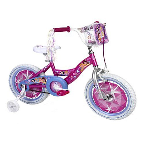 huffy Disney Princess Branded 16" Girls Bicycle in Hot Pink. Specifications: Steel Curbed Frame, Steel Unicrown Fork, Front Caliper/Rear Coaster Brakes, Padded Seat with Graphics, Steel Rims, Padded Handlebars, Training Wheels, Alloy Seat QR, Handlebar Bag, Crystal Cascade Streamers, Wheel Inserts, and Alloy 4-bolt Stem.
