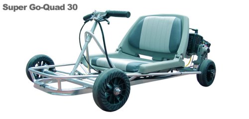 The New Super Go-Quad 30 is without doubts set to blow away any competition.Based on the highly successful platform of the original Go-Quad, the Skunk Werks set out to improve it even more by integrating what top racers have been doing to get the extra edge on the track and by making those proven modifications standard!A Live Axle Super-Go-QuadThe most important improvement in the New Super Go-Quad 30 was for PMW to leave the traditional one wheel drive design by going to a shifter cart inspired live rear axle, making the new Super Quad 30 two-wheel-drive and two-wheel-braking . Unlike all prior Go-Quad models, the Super Go-Quad 30 offers 100% of pure equal turning in both directions and puts an end to pulling towards one direction under braking. This major enhancement provides users with the most perfect handling capabilities. It gives them safe and absolute control while also achieving much faster track time.The chain driven/centrifugal clutch on the new Super Go-Quad 30 comes standard. It is set at a slightly lower gear ratio than the previous models to provide for the best acceleration off the line and out of corners.Improved front end geometry for the most superior handling performanceA newly designed steering plate has been added and allows the inside cornering wheel to turn slightly sharper than the outside wheel. Often referred to as "Ackerman Steering", this new feature produces excellent responsive turning. After extensive testing by PMW "Skunk Werks" and proven performance on the track, the caster - the angle in which the front wheels tilt s back - has also been optimized to 17 degrees to reduce "pushing" and consequently offer excellent cornering.The 2 full inch added to the length of the front axle also contribute to the Super Go-Quad 30 excellent stability and handling performance.The handlebars have been ergonomically enhanced. Wider, lower and slightly forward, they provide for a more aggressive location. TheyImages ScreenShot